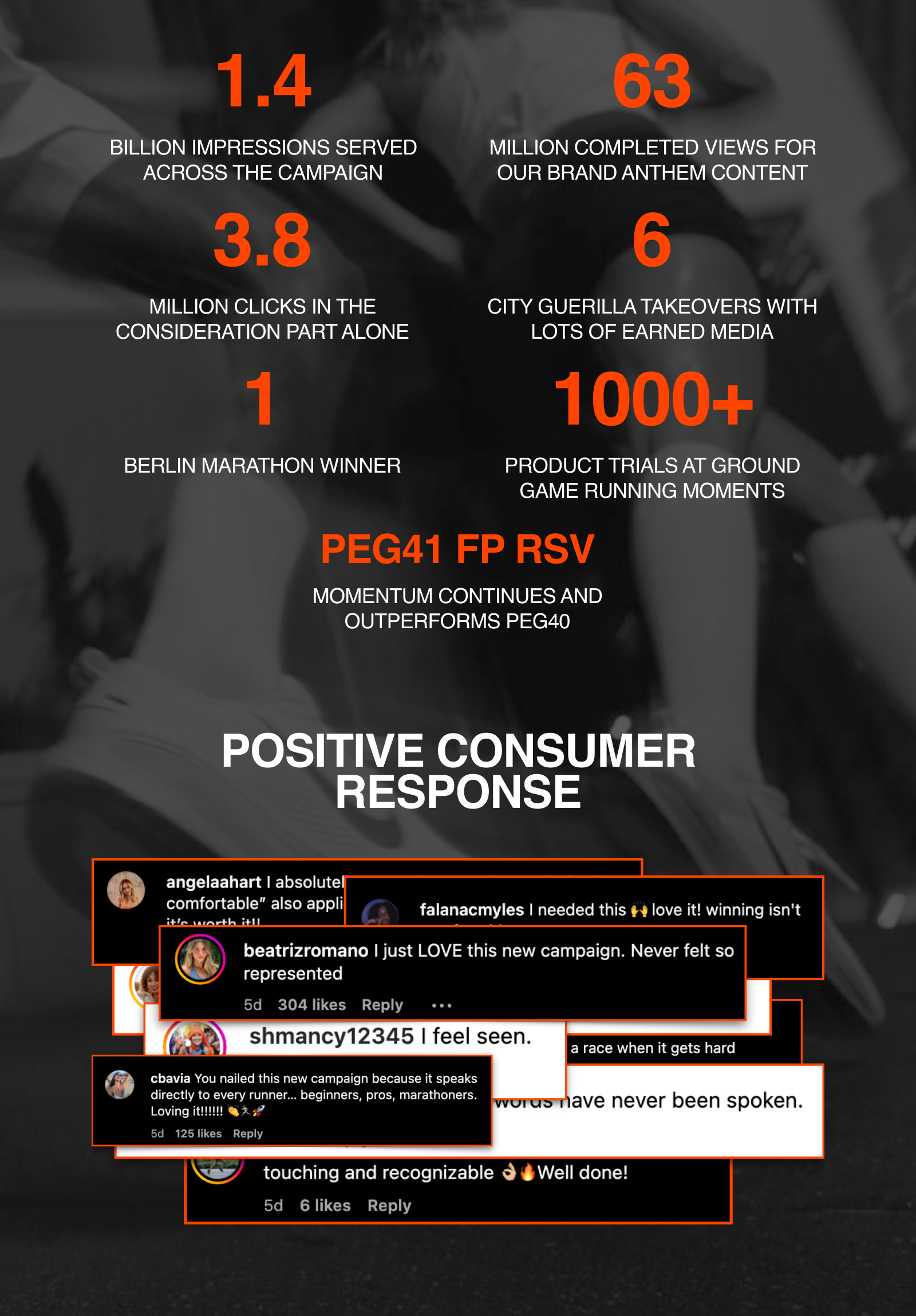 We elevated Race, Road & Trail Running in the moments that matter for our consumer through the Power of the Ground Game Offense. Leveraging our new brand voice and the Ground Game strategy, we disrupted with Nike distinction and energy at Copenhagen Half, The Berlin Marathon and UTMB.